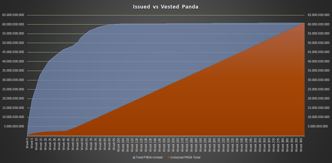 Like Bao, PNDA will unlock 5% of harvested tokens. With the remaining 95% being locked. Those tokens will lock until BSC block 15513277, and will unlock in a linear fashion until block 68079942 (roughly 6 years from the beginning of emissions)