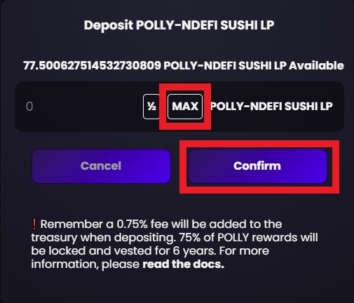 5) Select the amount of liquidity pool tokens to stake, then confirm the transaction in your wallet.