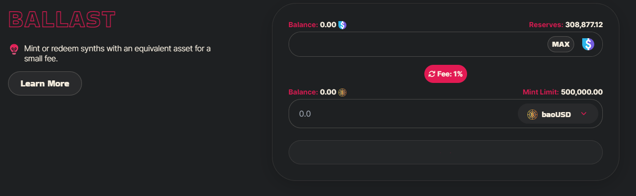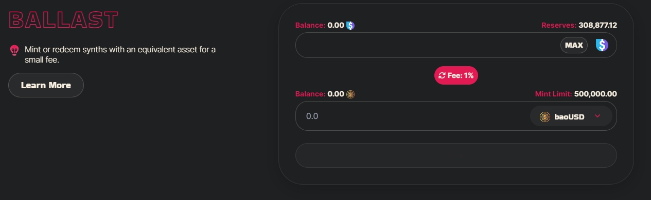The Ballast allows users to swap between synthetics and available LUSD/ETH for a 1% fee.